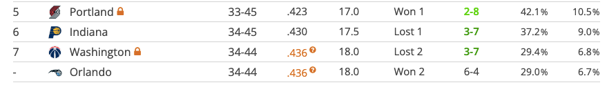 Orlando is the only team in the East outside of the play-in race but not eliminated. But their tragic number is 1, so the aforementioned elimination is a foregone conclusion.