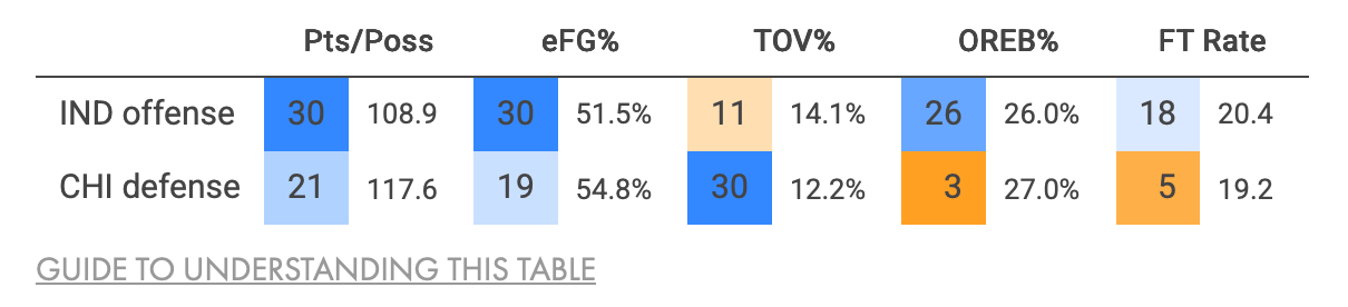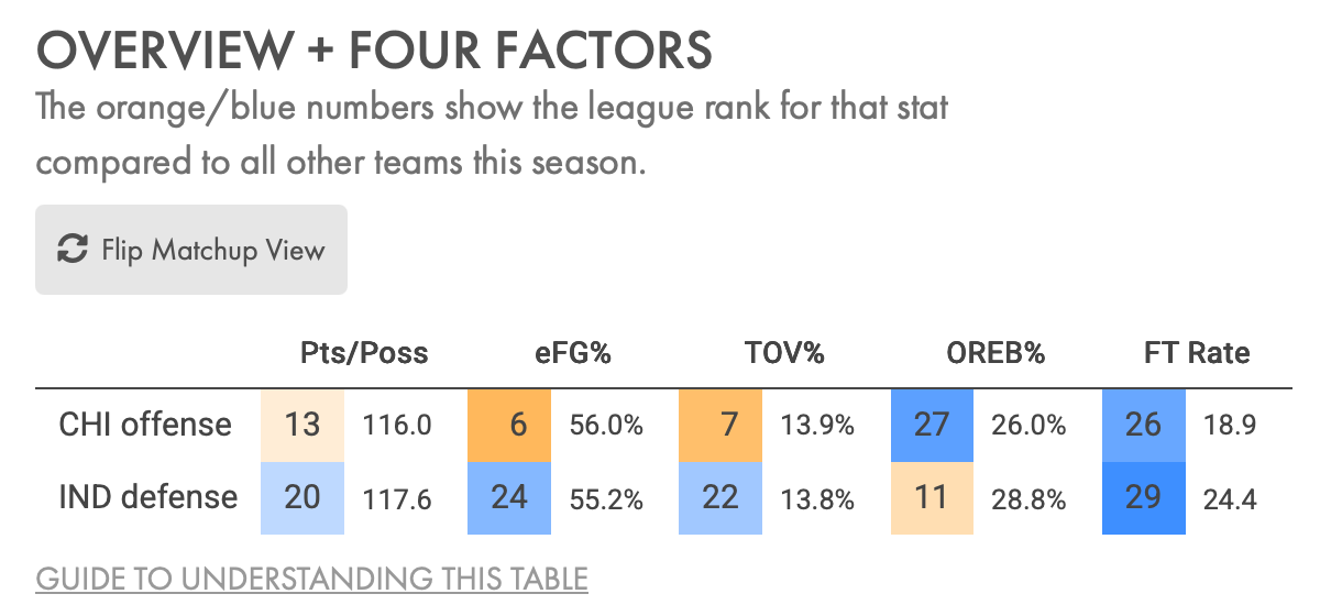 Chicago, conversely, is 5-2 over the last two weeks. During that stretch the Bulls had the most efficient offense in the league, scoring almost 125 points per 100 possessions. They are one of the teams that have adopted the Pacers style of playing fast and using their young athletes to their advantage.