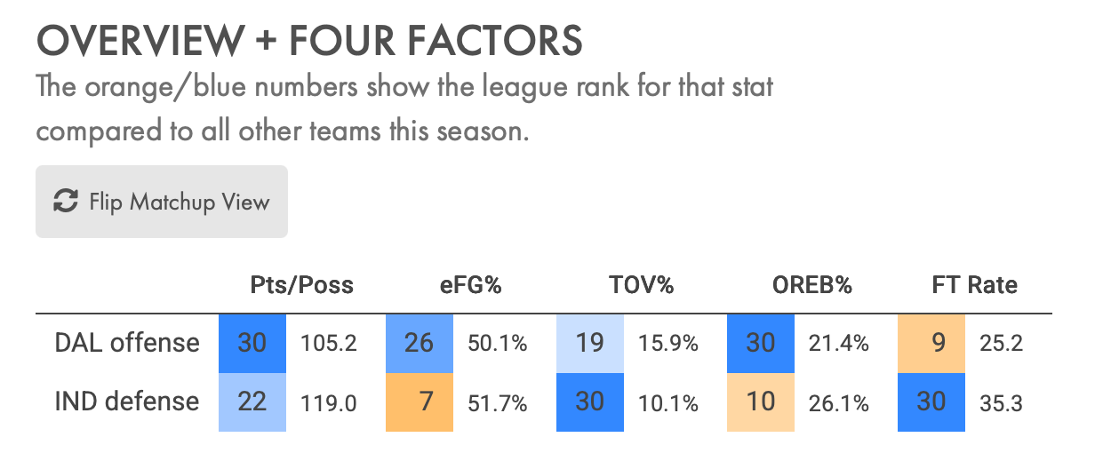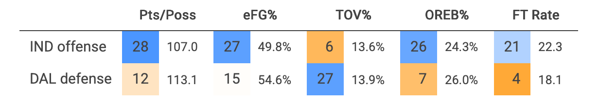 Dallas' size can still cause problems defensively for the Pacers, as their 12th ranked defensive efficiency shows. Though it must be pointed out, how much size they have available will depend on who suits up.