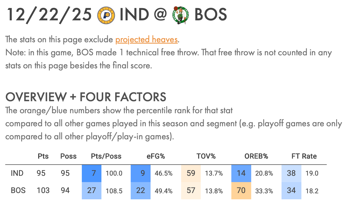 Tonight the Celtics come to town, who we almost beat two games ago. That "almost" is doing a lot of heavy lifting as the game was a tale of two halves. In the first, the Pacers played admirably. In the second, they couldn't hit the broad side of a barn. The results, as you can see below, was a good overall defensive performance brought down by woeful offense.