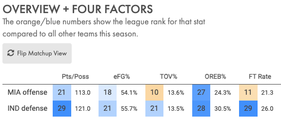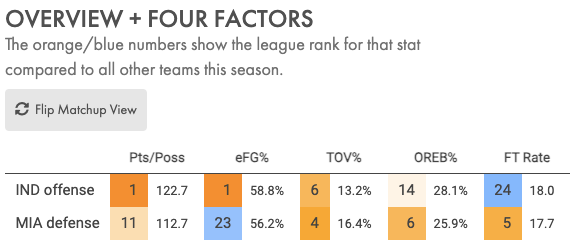 On the bright side, Miami isn't the most efficient offensive team (not that it matters against the Pacers' Swiss-cheese defense). The most encouraging thing I see in the image below is that Miami doesn't dominate the offensive glass. It feels like every opponent we've played in the past few weeks has been in the top half of the league. Hopefully we can hold them to one shot for most of the night (and hopefully those shots are contested and don't go in – but that feels like asking for too much).