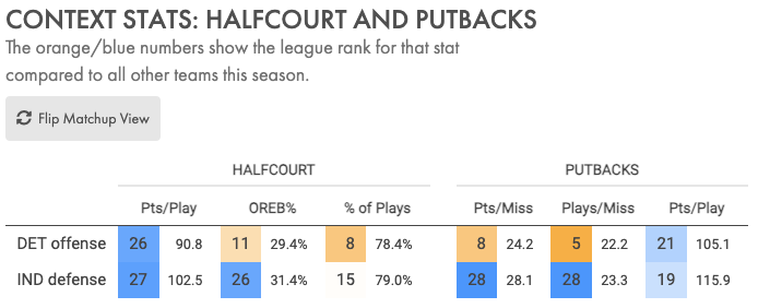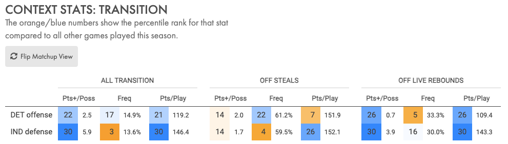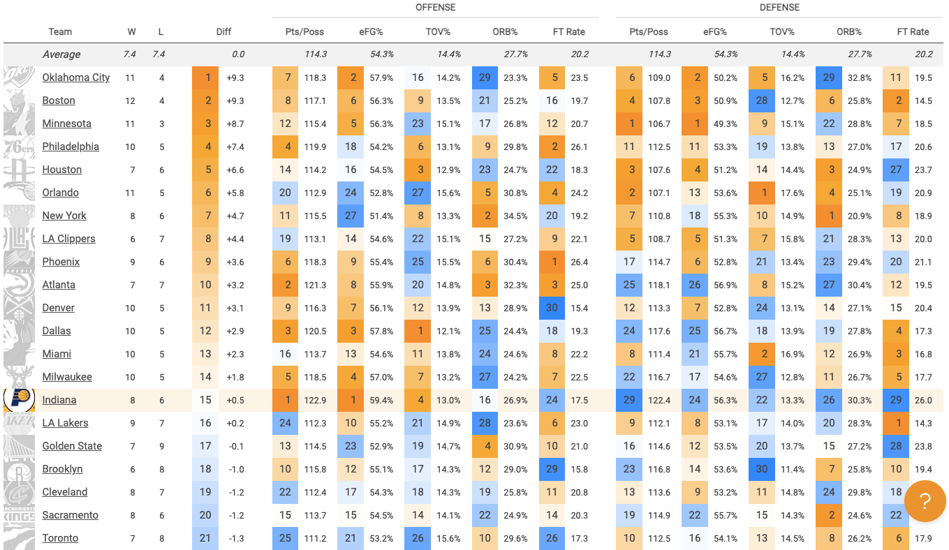 Despite his – and the team's – offensive brilliance, the Pacers simply cannot get stops. As a result, they are bang average on net efficiency. This confirms what my eyes have been telling me. For every thrilling win, it seems like the Pacers drop a game they should have won. By my count, 8 of the team's 14 games have gone down to the wire. I'm still too filled with turkey to do a deep dive on how abnormal that is in today's NBA, but it's safe to say that at least part of the reason the Pacers struggle to pull away (despite historic offensive numbers) is that they let opponents score at will. Essentially, the Pacers are trying to win games in the margins, hoping that their offensive efficiency will be slightly higher than the opponent's in a shootout.