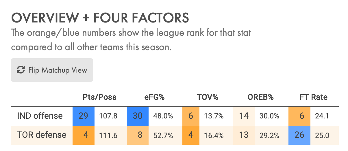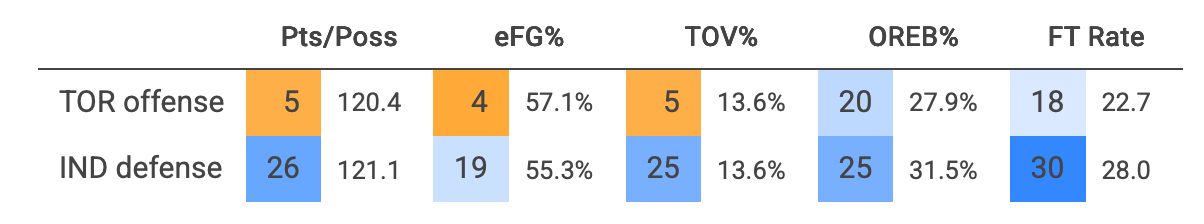 That will be tough against a Toronto team that plays much like the Pacers did last year. They come at you in waves and push the pace in transition. About 20% of their possessions are considered transition opportunities, most in the NBA. That starts with their aggressive defense and ability to generate turnovers.